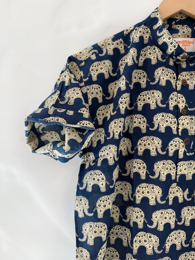 Elephant Print Half Sleeve Cotton Short Kurta for Men