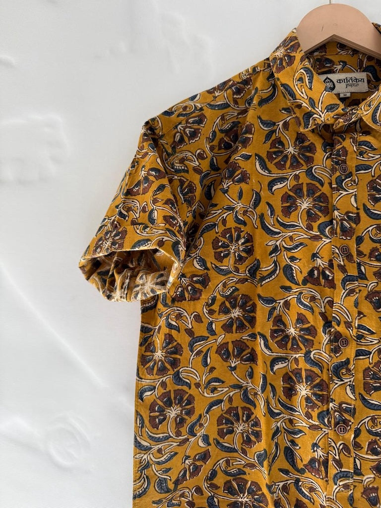 Floral Print Block Print Cotton Shirt For Men - Mustard