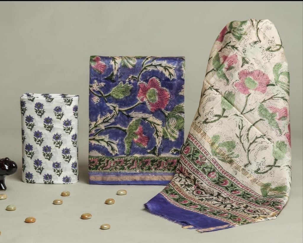 These beautiful suit sets are handcrafted using blocks along with natural colours. Fine Quality unstitched suit set with dabu print handcrafted with love in Jaipur, India.