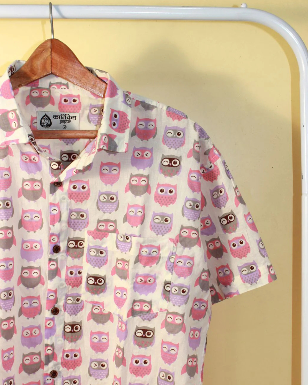 Magenta Owl Print Cuban Cotton Shirt for Men