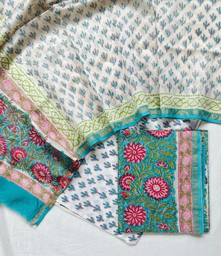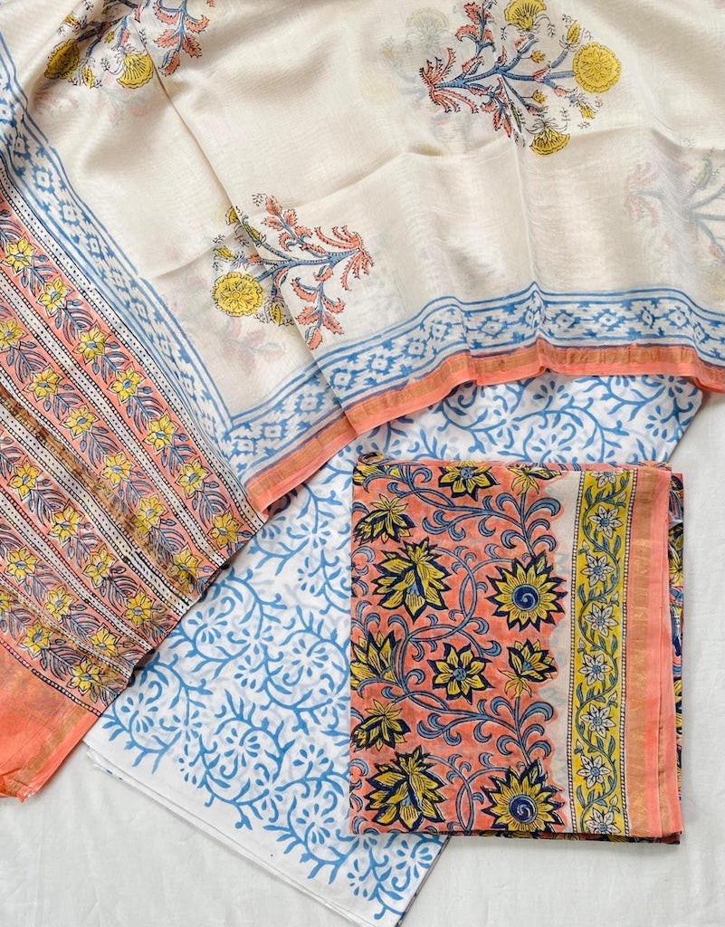 About the Craft: These beautiful unstitched suit sets are handcrafted using hand work along with natural colours. These unstitched suit are handcrafted with love in Jaipur its is in silk for top & dupatta & for botton in Cotton fabric, India. Color is very minimal with superb quality. The Hand block print with natural dye and Pure cotton. Please note that slight color variations may occur due to differences in studio lighting and sunlight effects.